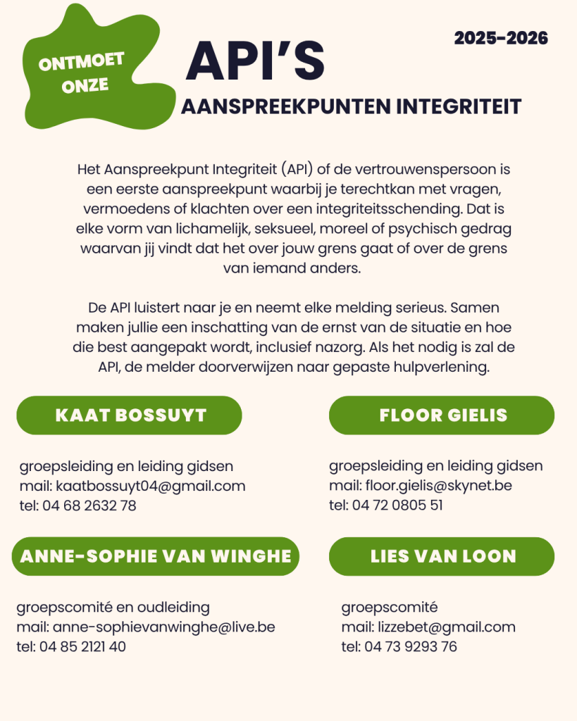- Kapoenen, kabouters, welpen, jonggidsen, jongverkenners, gidsen en verkenners: geen gebruik of bezit, niet onder invloed tijdens activiteiten.